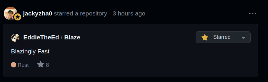 At first, I was in disbelief. I was confused. It's that feeling you get when your casual routine, i.e. checking Github, is turned on its head. I'll be honest, I stared at my phone for a solid 10 seconds. Maybe even more. I just couldn't wrap my head around it. The legendary Jzhao, who basically inspired Blaze, giving his stamp of approval? Or interest. Who knows, I'm not gonna break down and analyse the meaning of starring things on Github. But regardless, the sense of joy and validation is immensely gratifying.