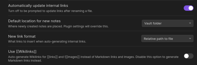 Configure your Obsidian vault settings as follows. The most important setting is absolute pathing and no wikilinks. 3